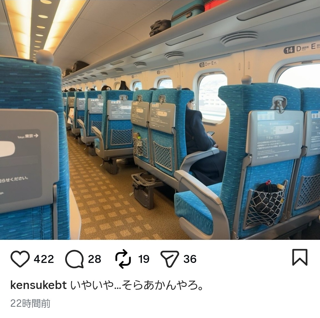「投稿者は、新大阪から博多に向かう新幹線のグリーン車に乗っていたそうで、同車両で6人の年配男性が宴会のようにお酒を飲み騒いでいたそうです。