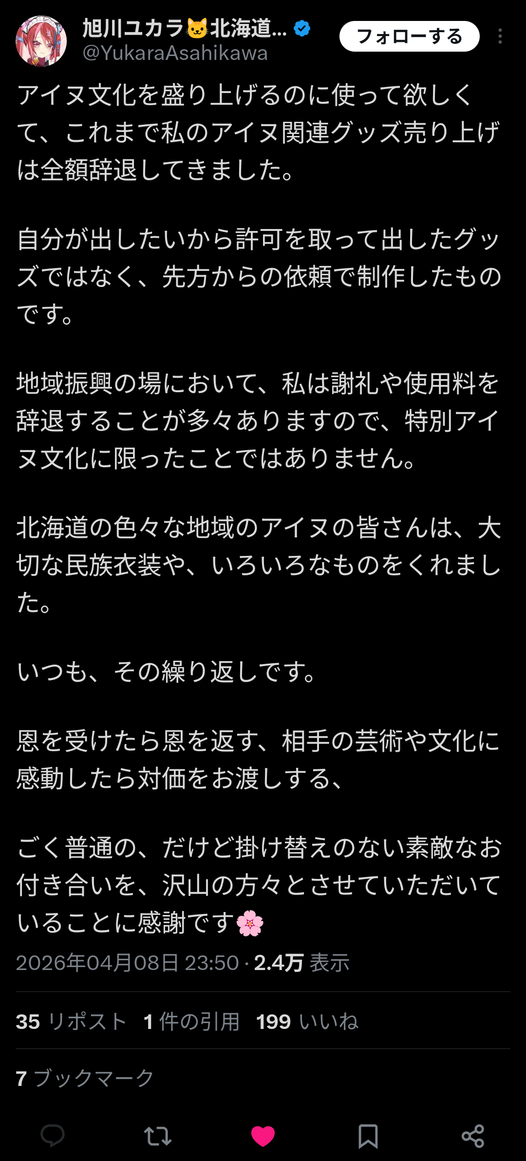 — 旭川ユカラ🐱北海道旭川市ご当地VTuber🐱 (@YukaraAsahikawa) April 8, 2026