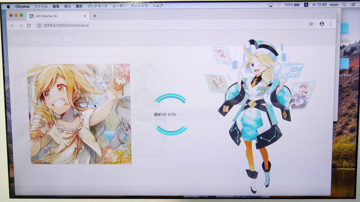 ※展示のデモでは、ローカルマシンに推論プログラムを置いて数秒かけて計算させた(左)、他のイラストを評価した例(右) 背景がない、塗り方が主にアニメ塗りなど判定されている