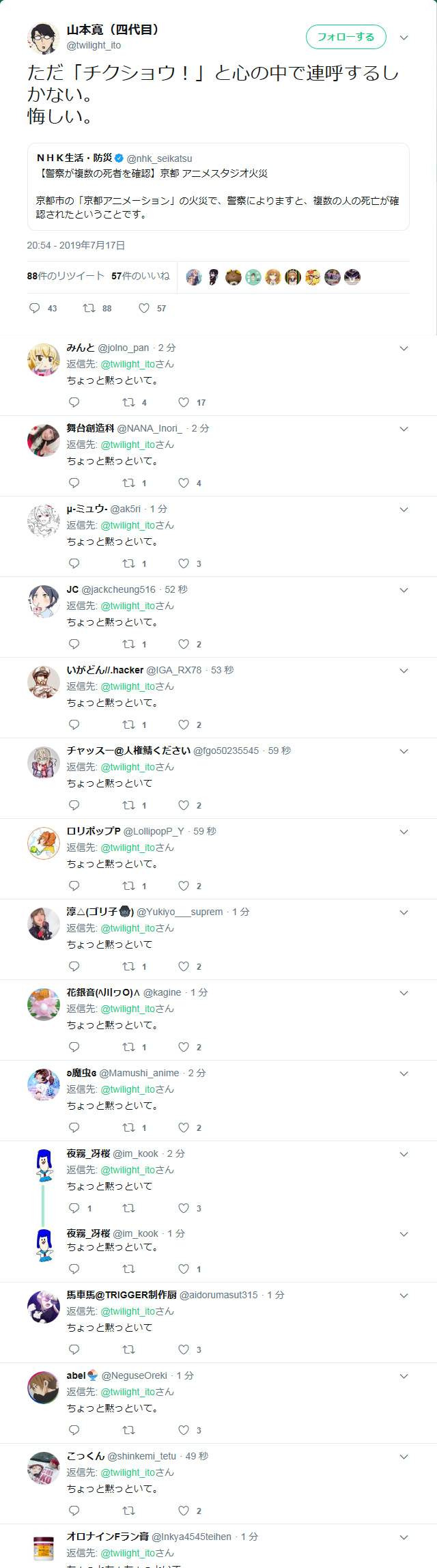 自分の作品にかかわってくれた人が京アニにいたかもしれないし、フリーでヘルプに行って巻き込まれている可能性も否定はできないよな。