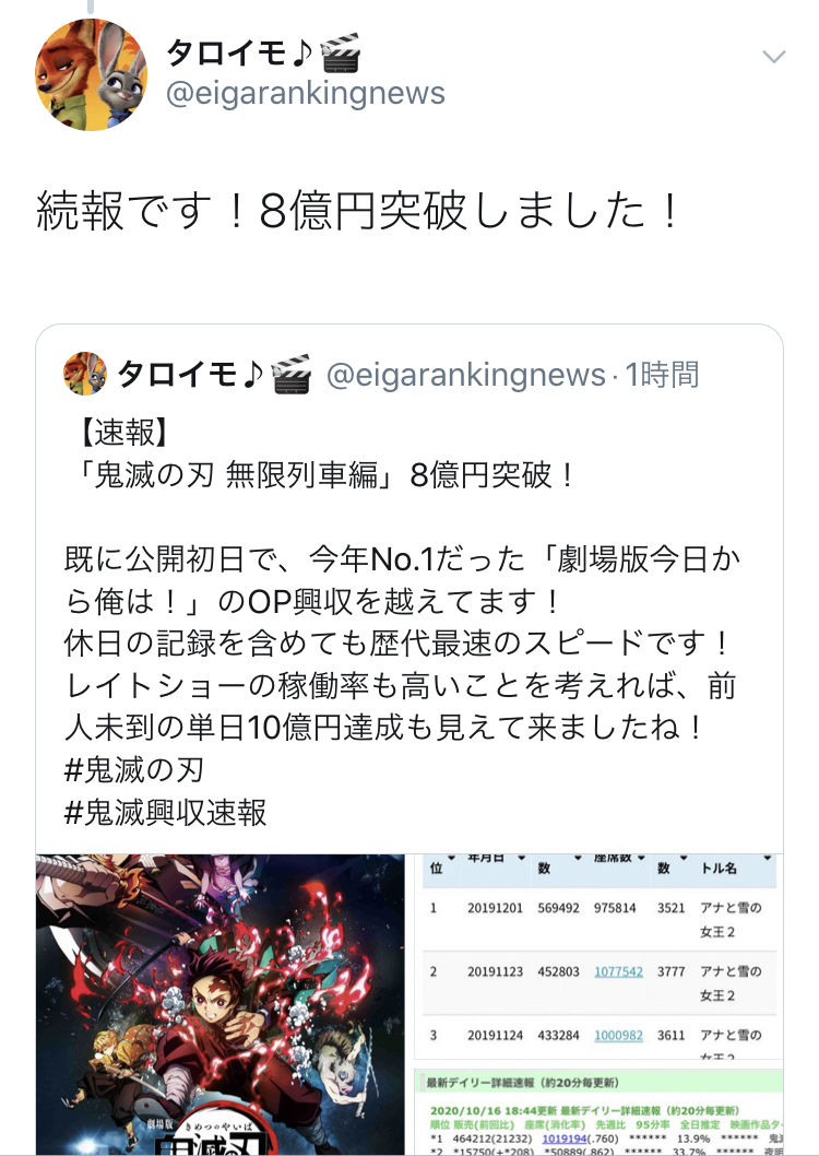 2020/10/16:442980 :鬼滅の刃 無限列車編 ←現時点(※平日)
