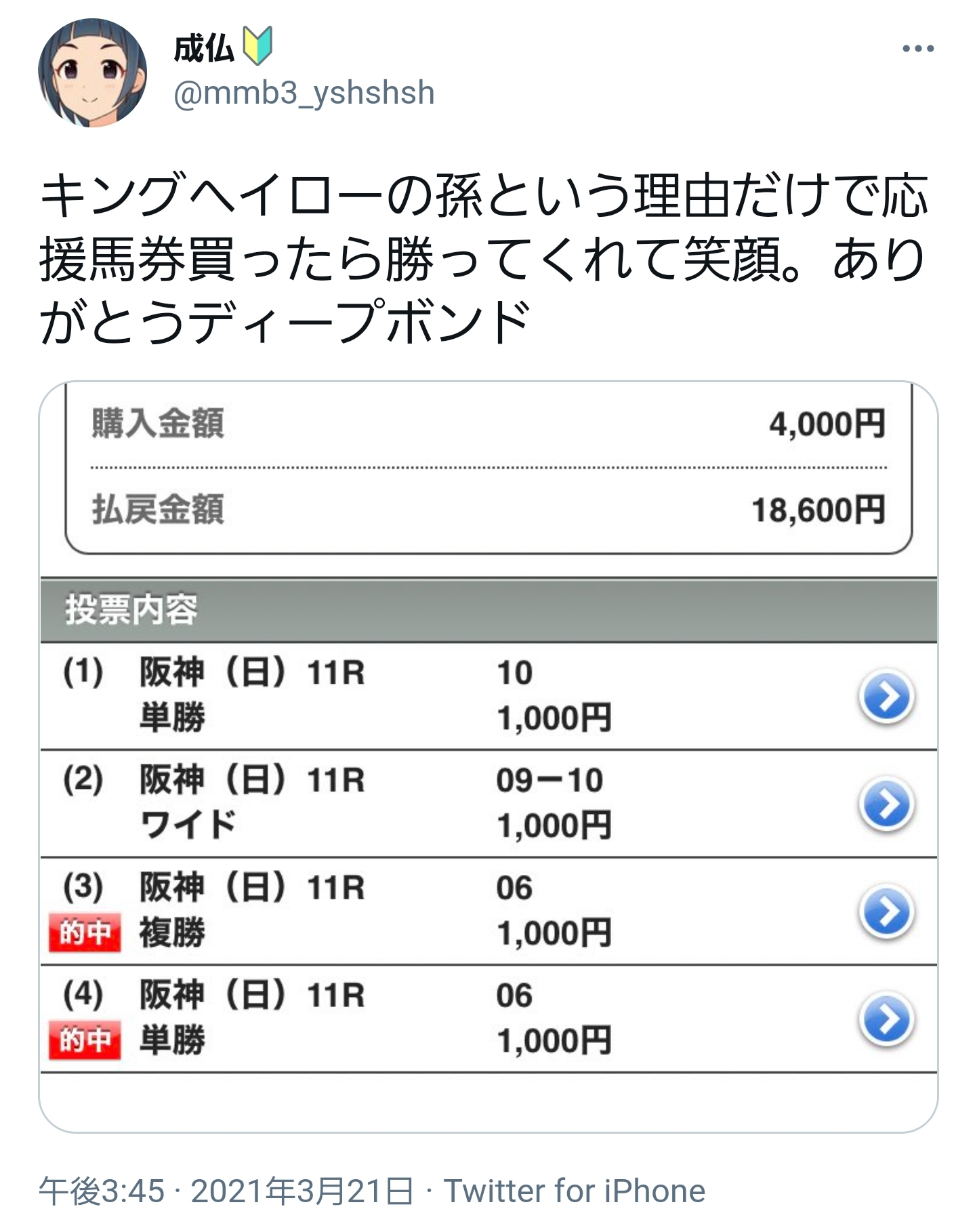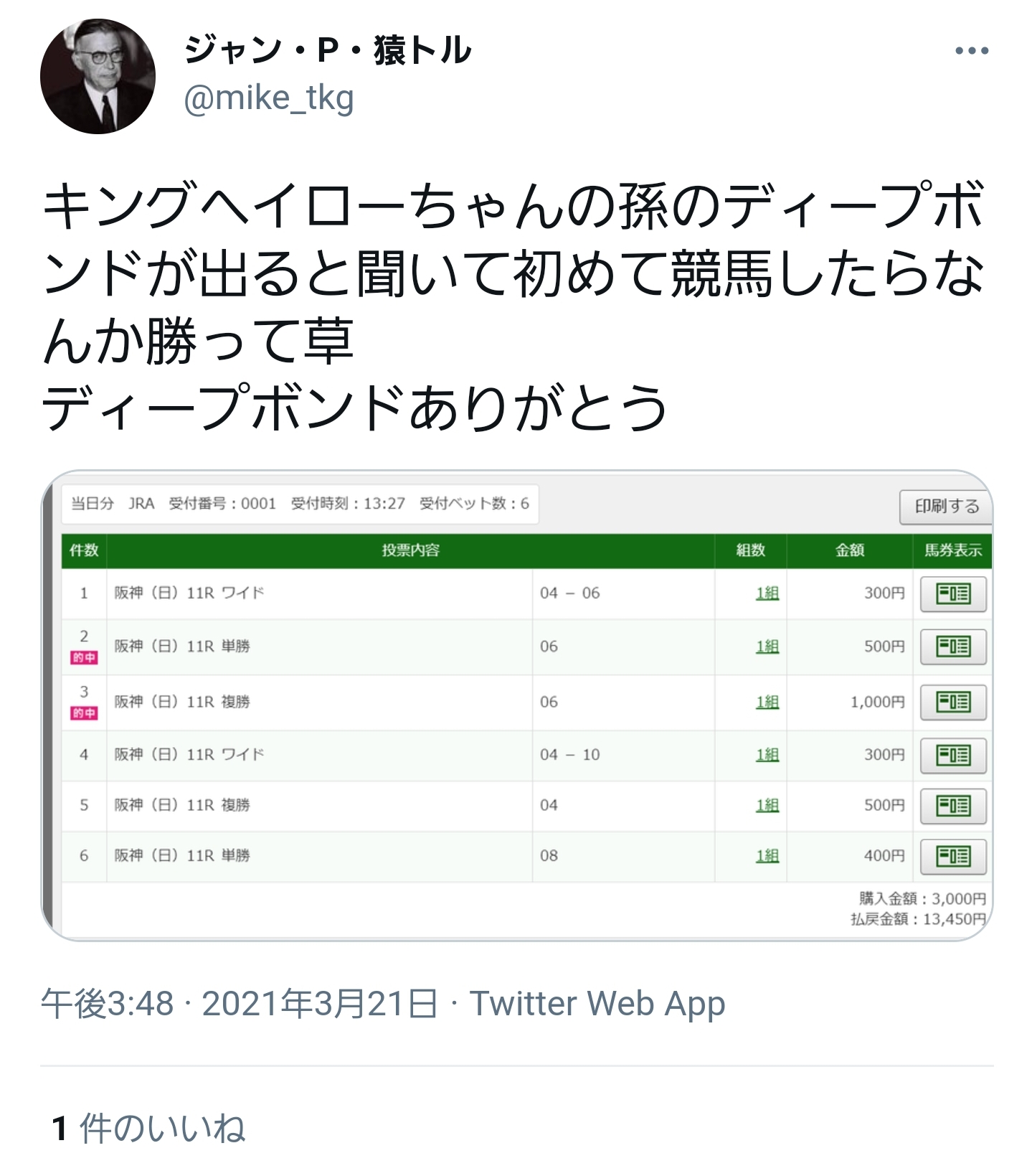 応援馬券購入したら的中した、ってニュースになってただろw