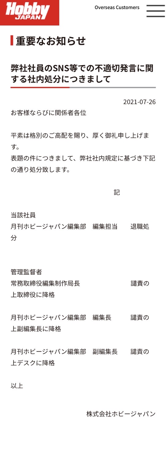 上司に部下の不始末の責任とらせるくらいのことしないと同業や取引先は「あの会社は業界の信用を下げやがった信用できない会社」って思うからな。この処分は炎上対策としては上手くやったと思うわ