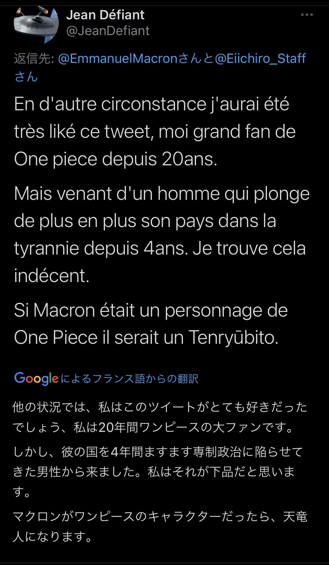このひと時を皆さんと分かち合えることをとても嬉しく思います。「AKIRA」「FAIRY TAIL」「ダークソウル」「光」をはじめとする皆さんの数々の作品は、日本だけでなくフランスでも神話になっています。文化は人々を結びつけます。友… https://t.co/qFQIXL0uxe